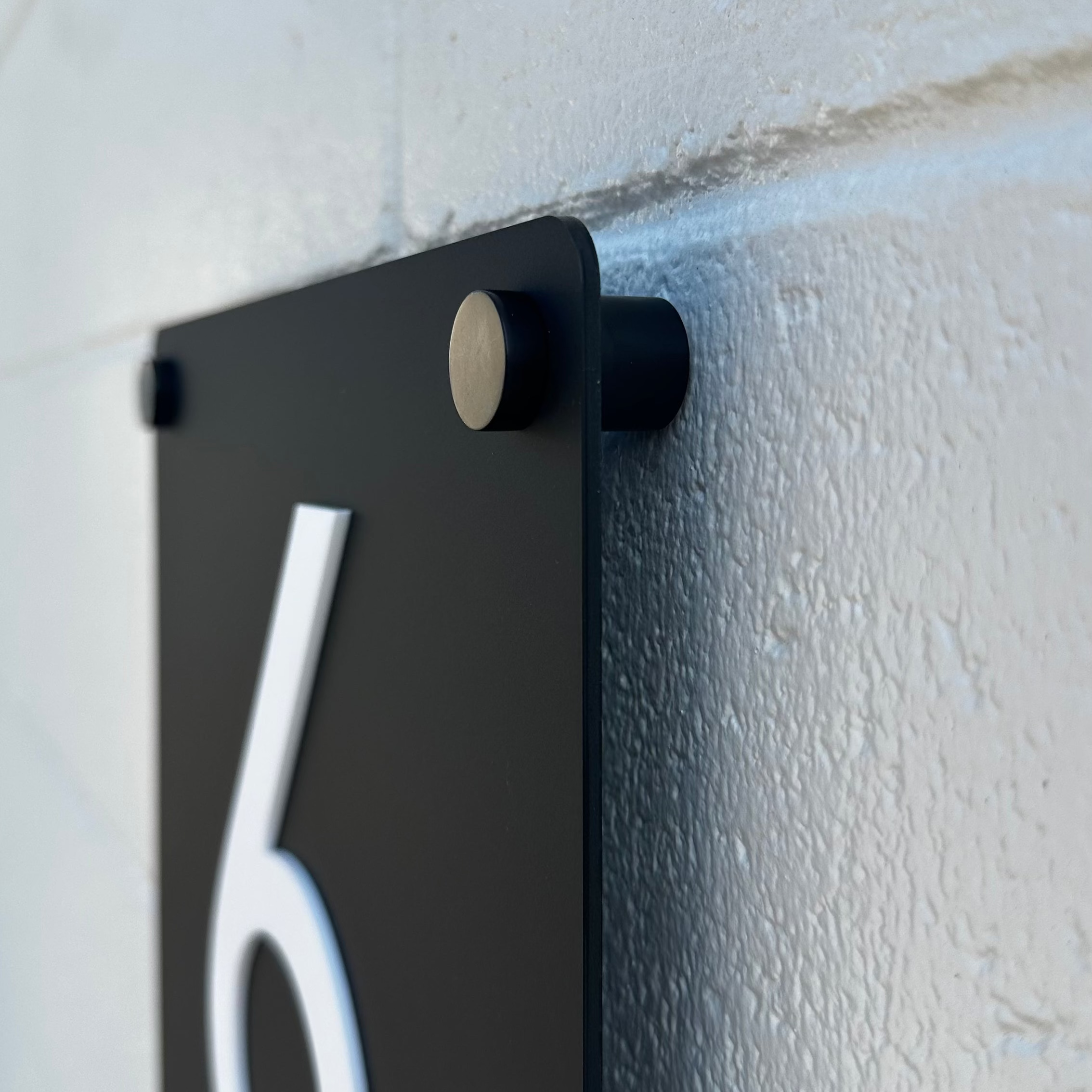 Dagood sign standoffs allow acrylic house signs to be screw-mounted to a wall with a clean, intentional gap behind the sign. This creates a modern floating appearance and a secure, long-term installation.