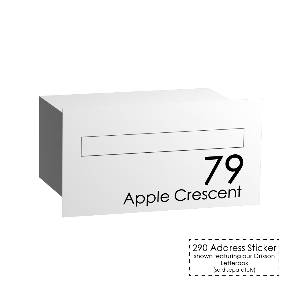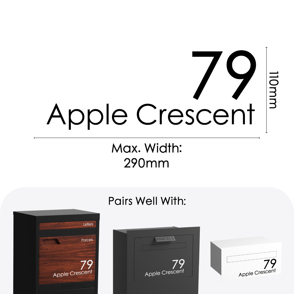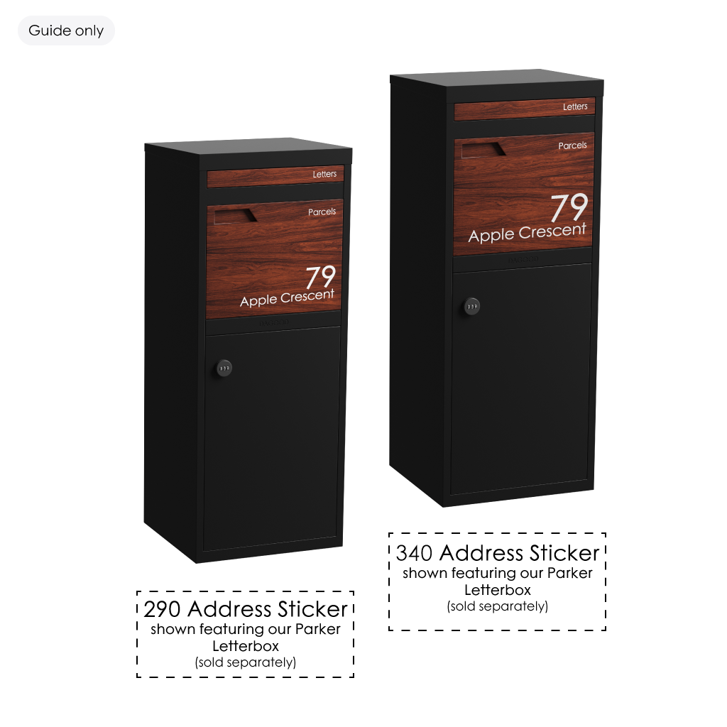 Placement tip: On most freestanding letterboxes, we recommend placing signage on the top chute/upper panel for the cleanest proportions and visibility. (Apex is the main exception — its larger bottom panel also works well.)